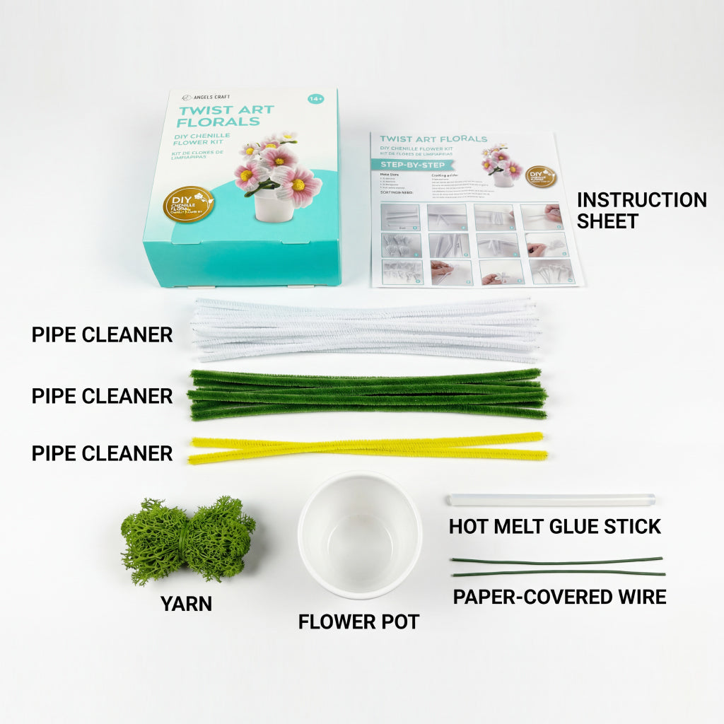 Chenille stems, yarn, mini flower pot, glue stick, paper-covered wire and instruction sheet.